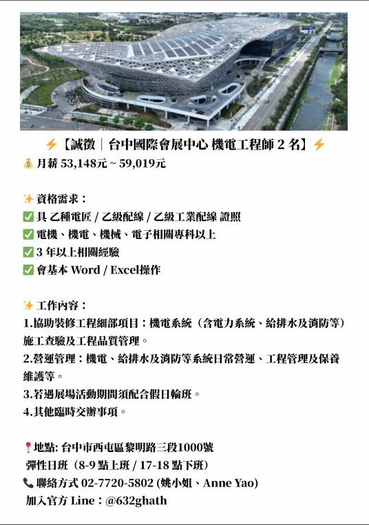 台中國際會展中心-機電工程師二名